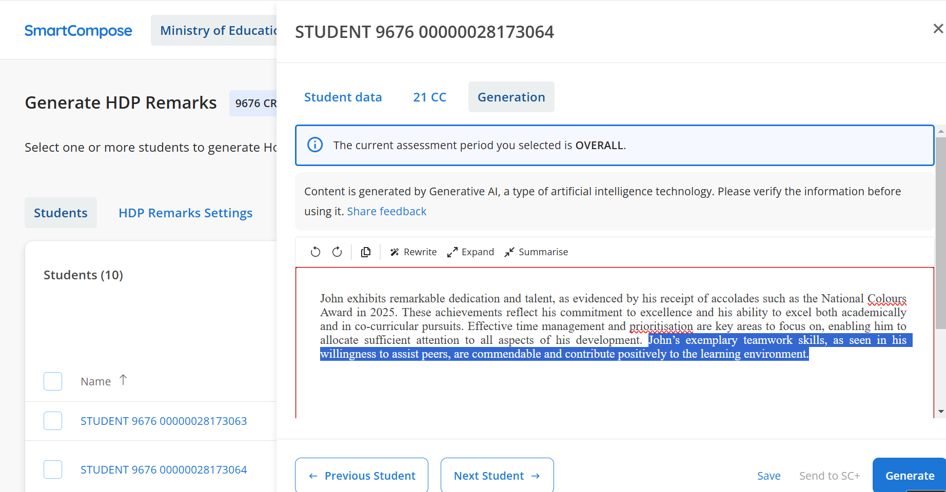 The system auto-generates HDP remarks, SGCs, and scholarship testimonials, supports non-English teachers with linguistically accurate drafts, and produces draft outputs based on suggested structures and guidelines. From quick remarks to detailed graduation testimonials, let AI handle the drafting while you add the personalised finishing touches.
